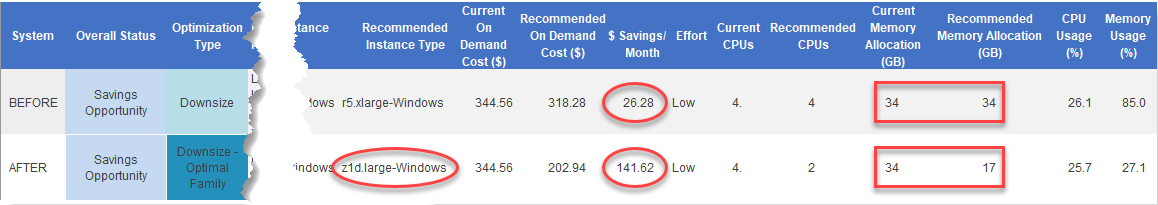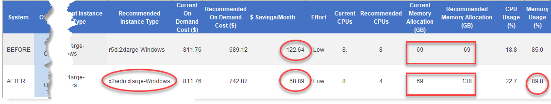 The second row shows a recommendation that was generated using actual, collected memory data. Densify identified almost $69 in monthly savings, but also recommends increasing the memory allocation, based on the actual data showing that more memory is needed for the workload. Even with the increased memory allocation, the memory utilization (%) increases to almost 90%.