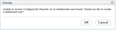 - If there are no dashboards in Densify, the Configure My Reports page is not available and you will see the following message that prompts you to create a dashboard. Click OK to be directed to the JasperReports Server console.