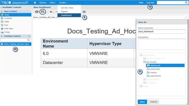 - If an appropriate dashboard does not exist for your custom report, create a dashboard from the integrated JasperReports Server console. Refer to Creating Dashboards for detailed process steps.