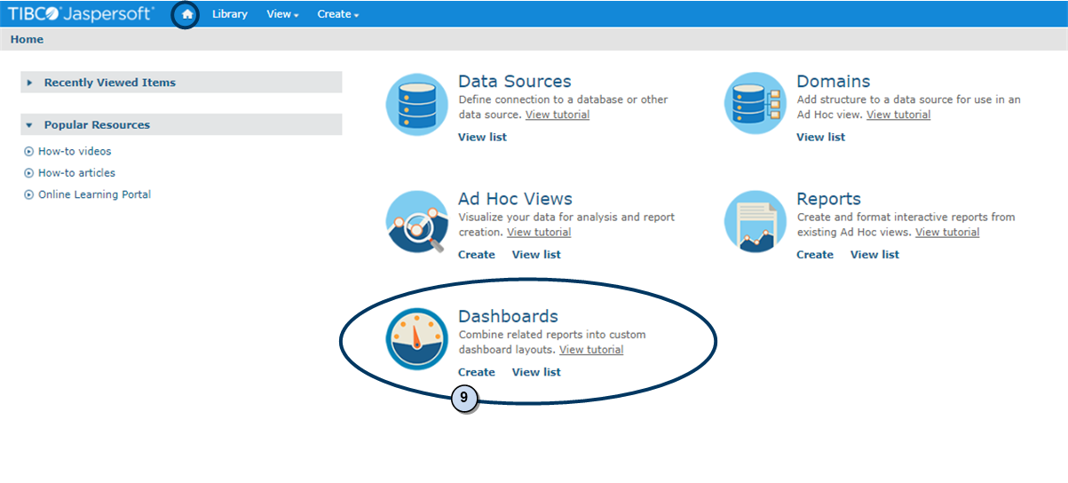 - On the JasperReports Server home page select Dashboards > Create. Alternately, click the toolbar Create > Dashboard.