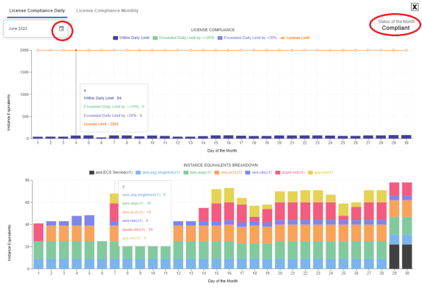 - The License Compliance Daily tab is selected by default. You will see your current compliance data for the current month. Click the calendar icon to review historical data.