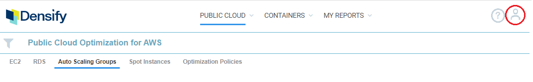 - In the Densify Console click the User icon in the top right corner of the page.