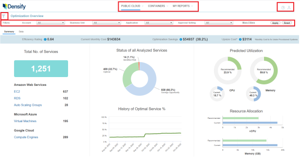 The Densify Console is available to all Densify SaaS users after bypassing the initial Densify landing page. A menu at the top of the console provides you with access to features and reports applicable to your Densify user role. The main report content page, filters, settings, and available toolbar items are dependent on the menu feature you select.