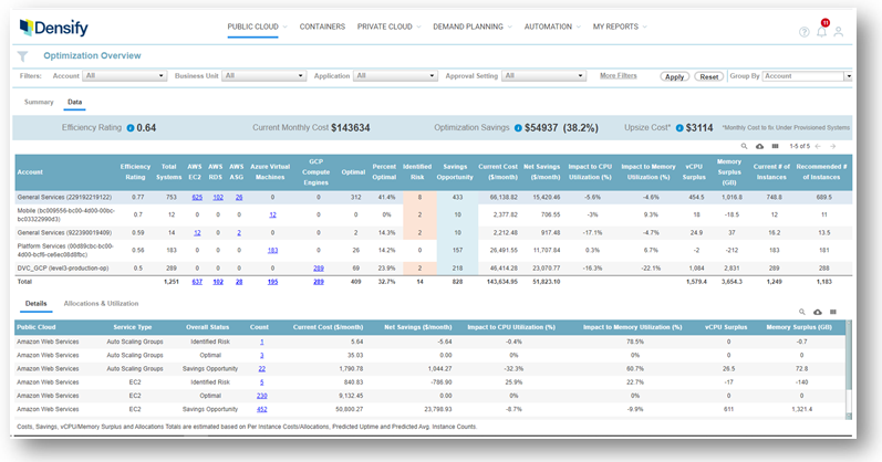 The Optimization Overview report provides a summary of optimization opportunities and ways to mitigate risk for your public cloud instances. This report aggregates the analysis results for all your public cloud platforms.
