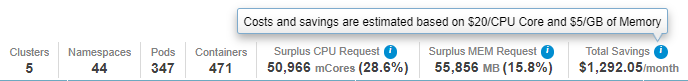 A summary of the running totals is displayed in the upper right corner at the top of each of the following pages Cluster Breakdown tab, Namespace Breakdown tab and the Details tab.The Information icon, on these values indicates that these values do not include containers with requests set to "Unspecified". In this case, 'unspecified" means there are no request or limit values specified in the container manifest file for CPU and/or memory.