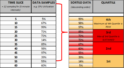 - The 12 values are then re-ordered in descending order and separated into equal sample sizes (quartiles), with each quartile having three values. Each quartile represents 25% of operational time.