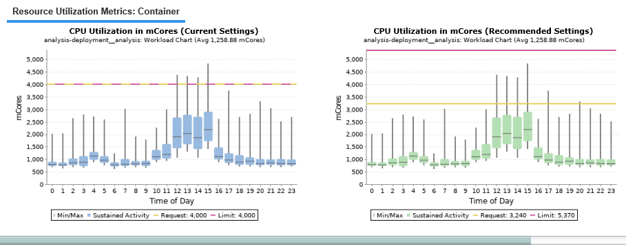 If a container instance has been optimized (i.e. limits or request values have been changed based on a recommendation), then the next day you will see the Optimization Type set to "Just Right" and since the required data (as defined by the policy) has not been accumulated, it will show the recommended request and limit values for both CPU and memory will be populated with the current CPU and memory request and limit values during the workload invalidation period, on the Resource Utilization Metrics tab.
