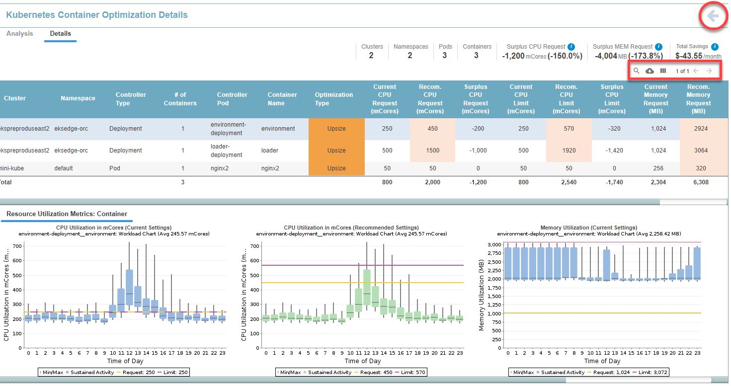 Shown in bold at the bottom of the table, the totals for each column for all the records in the filtered tabular report. The total, listed at the bottom of the Request and Limit columns for both CPU and Memory, is calculated as (Current CPU Request * Current Count). This formula is also used for CPU Limit, Memory Request and Memory Limit. The total, listed at the bottom of the Surplus columns for both CPU and Memory, is calculated as: (Current - Recommended). If the value of any row is unspecified, then that value is treated as "0" when summing the values for the total. |