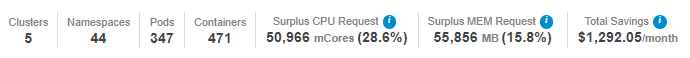 The information icon, on the Surplus CPU Request/Surplus Memory Request and Net Savings values indicates that these values do not include containers with requests set to "Unspecified". See Optimizing Your Containers.