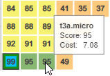 The score shown in each cell in the catalog map is based on the current utilization and Densify's analyses results. These calculations account for both compatibility of the workload with an instance type's features and its monthly cost.