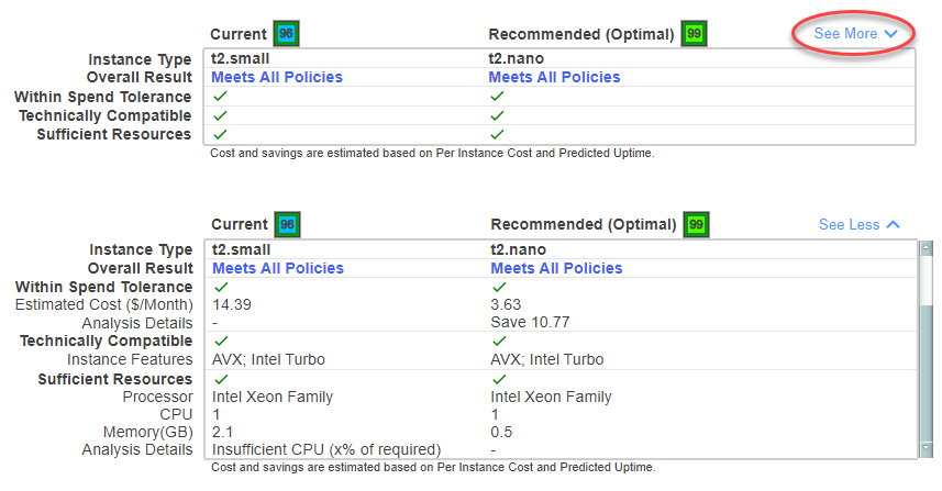 The following details are provided for both current and recommended instance types. The indented columns are only displayed with you expand the table by clicking on the See More link.