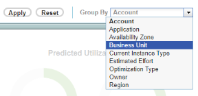 The Group By dropdown menu is located at the right edge of the filter strip. The menu is populated with the properties and tags that have been assigned to your instances. The following options are available for cloud environments: