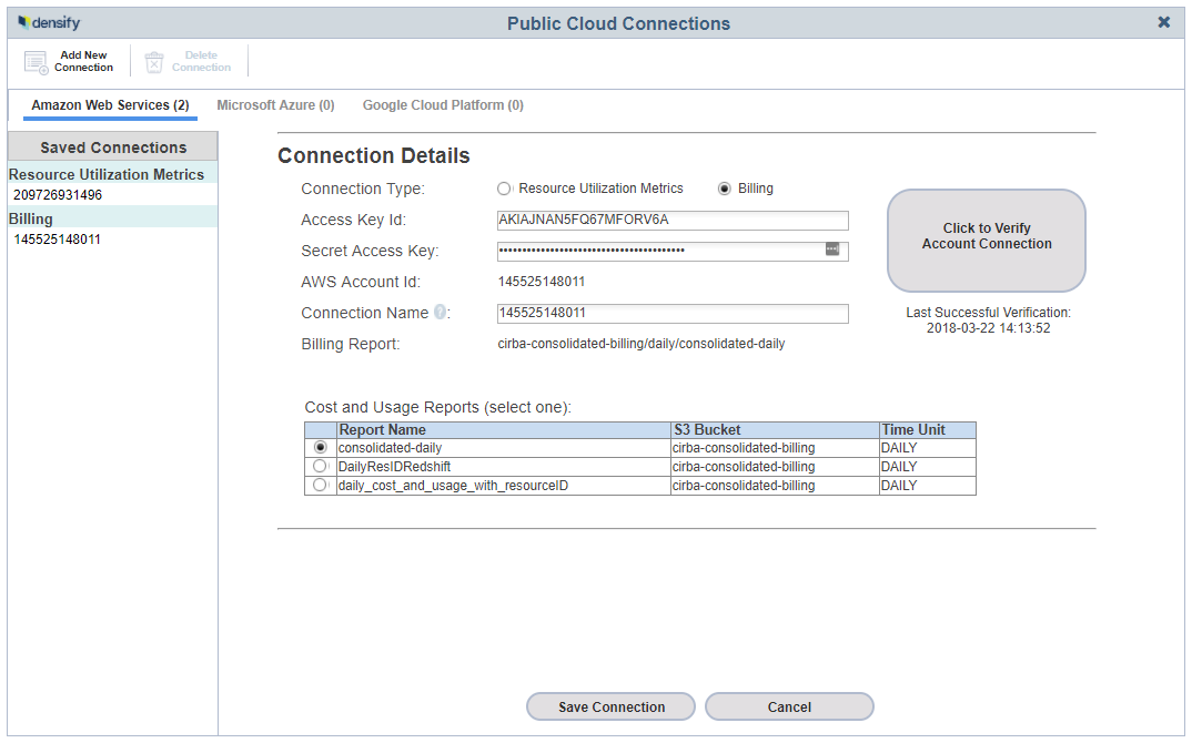 • If the credentials are valid, you will be connected and authenticated. Once the account is verified, Densify discovers the AWS account ID and displays the ID number. See Table: AWS Connection Parameters - Billing below.