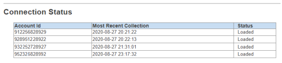 13. The connection status, at the bottom of the page, will be updated. You will also see the connection listed in the Saved Connections section, under the Resource Utilization Metrics heading for a configuration/workload connection or under the Billing heading for a billing connection.