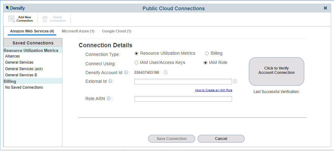 Use the connection name to clearly identify the AWS connection in Densify. This name will appear in the Saved Connections list and based on the connection type, it will appear under the corresponding Resource Utilization Metrics or Billing heading.
