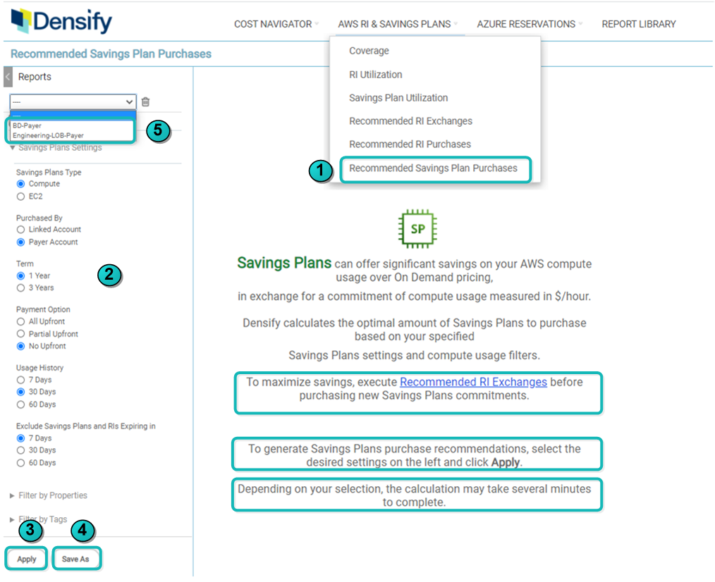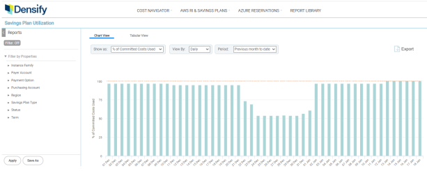 - On the left side of the page select the settings and filtering options to define the scope of the report. See Savings Plan Settings for details.
