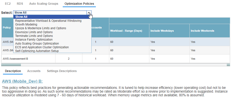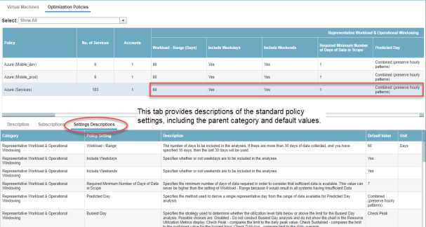 - Optimization Policies—Displays the cloud policies and their settings. This tab is similar to the top pane of the Optimization Policies page with "Show All" selected in the policy category filter.
